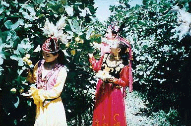 無花果,維吾爾語稱“安吉爾”,原產(chǎn)中亞波斯,10世紀(jì)前后傳人阿圖什。無花果樹雌雄異花,花隱于囊狀花托內(nèi),平常人只見其果,不見其花,故而得名。無花果實(shí)為扁圓形,果皮為金黃色,果肉細(xì)軟,汁濃,含糖量高達(dá)74%以上,其味甘甜可口,營養(yǎng)豐富,含有豐富的氨基酸、多種維生素和人體所需的多種礦物質(zhì),并有滋補(bǔ)、健胃、祛風(fēng)濕和防癌等作用。無花果曾被譽(yù)為“仙人果”和“人參果”,當(dāng)?shù)鼐S吾爾族群眾更是稱其為“樹上結(jié)的糖包子”。