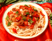 拉條子常用的拌菜是過油肉,雞蛋炒西紅柿,辣子炒羊肉,芹菜肉片等等。拉條子消暑耐饑,在炎熱的夏天,若早晨美美吃上一頓拉條子,到晚間也不覺得饑餓。更為有趣的是,把拉條子切成三、四厘米長(zhǎng)的小段,和油、羊肉、大蔥、西紅柿、辣椒等爆炒,即成爆炒面,其風(fēng)味與拉條子又迥然不同了。
