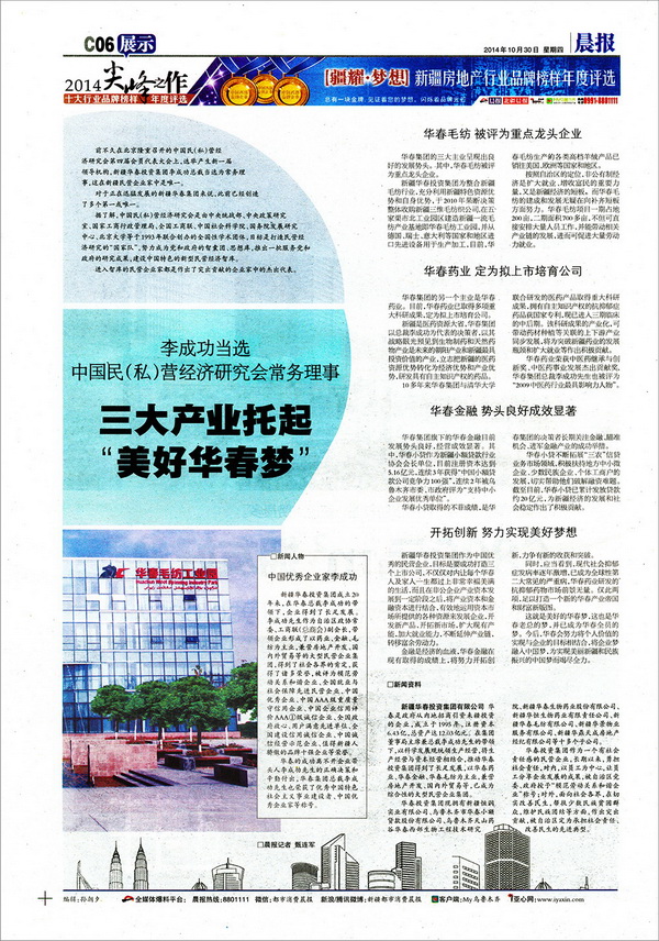 10月30日的《晨報(bào)》于C06版用整版篇幅,以“李成功當(dāng)選中國(guó)民(私)營(yíng)經(jīng)濟(jì)研究會(huì)常務(wù)理事,三大產(chǎn)業(yè)托起美好華春夢(mèng)”為題,對(duì)華春大業(yè)進(jìn)行了專題報(bào)道。