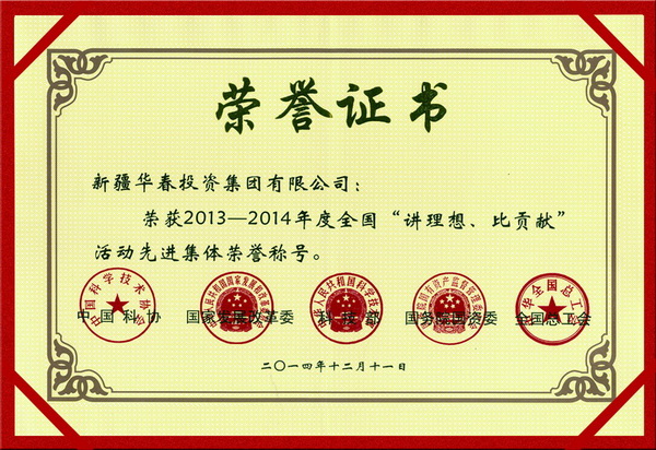 3月24日,在自治區(qū)科協(xié)全委會(huì)議隆重的頒獎(jiǎng)儀式上,頒發(fā)了由中國(guó)科協(xié)、中華全國(guó)總工會(huì)、國(guó)務(wù)院國(guó)資委、發(fā)改委、科技部聯(lián)合表彰的2013-2014年度全國(guó)“講理想、比貢獻(xiàn)” 活動(dòng)先進(jìn)集體和個(gè)人的獎(jiǎng)牌和榮譽(yù)證書,新疆華春投資集團(tuán)和李成功總裁分別被授予全國(guó)“講理想、比貢獻(xiàn)”活動(dòng)先進(jìn)集體和優(yōu)秀組織者榮譽(yù)稱號(hào)。