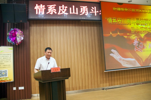 會(huì)上,自治區(qū)政協(xié)常委、見(jiàn)義勇為基金會(huì)副理事長(zhǎng)、新疆華春投資集團(tuán)董事局主席李成功先生代表見(jiàn)義勇為基金會(huì),宣讀了“情系皮山勇斗暴徒群體 助力反恐英模重建家園”公益活動(dòng)倡議書(shū)。向全社會(huì)倡議全區(qū)各級(jí)黨政機(jī)關(guān)、企事業(yè)單位、社會(huì)團(tuán)體、民間組織和廣大黨員干部、愛(ài)心人士,響應(yīng)以習(xí)近平同志為總書(shū)記的黨中央、國(guó)務(wù)院號(hào)召,落實(shí)張春賢書(shū)記“感恩黨中央特殊支持,把恢復(fù)生產(chǎn)、重建家園作為重大任務(wù),確保受災(zāi)群眾安全過(guò)冬”的批示精神,伸出援助之手,為幫助在皮山縣發(fā)生6.5級(jí)地震中房屋嚴(yán)重受損的麥麥提敏•阿卜杜喀迪爾等6位反恐英模重建家園、恢復(fù)生產(chǎn)奉獻(xiàn)一片愛(ài)心、貢獻(xiàn)一份力量!