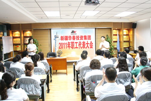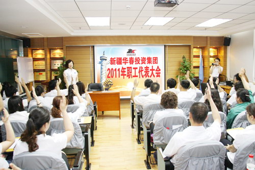 新疆華春投資集團有限公司職工代表大會于2011年6月11日上午在華春集團恒潤公司培訓室召開。51位參會的職工代表,肩負著集團與各子公司的430多名員工的重托,對“三項集體合同”即集體合同、工資集體協商合同和女職工權益保護專項集體合同草案進行了審議,經大會討論和民主表決,“三項集體合同”草案獲得通過,并形成職工代表大會決議書。