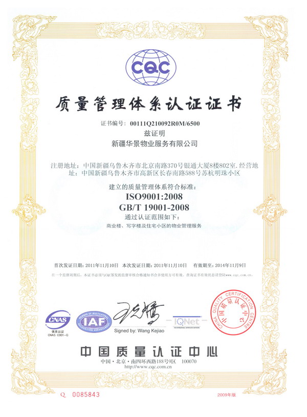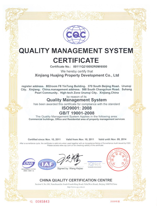 為了能夠長期、穩定地向業主提供滿意的服務和品質,華景物業始終堅持以創新科技求發展,以高質量求生存,推行先進的管理理念,建立最新的管理質量體系作為企業宗旨,使公司能夠早日與國際質量體系接軌。2011年在公司領導的大力倡導下,在各職能部室的全力配合下,由中國檢驗認證集團新疆有限公司委派的審核組成員一行五人,依據GB/T19001-2008標準、相關法律法規的要求,對華景物業公司認證范圍內所涉及的商業樓、寫字樓和住宅小區的物業管理服務過程進行了現場審核,經過為期兩天的現場審核,審核組成員對華景物業ISO9000管理體系建立的有效性和符合性給予了肯定,并與2011年11月10日正式取得了由中國質量認證中心頒發的質量管理體系認證證書。