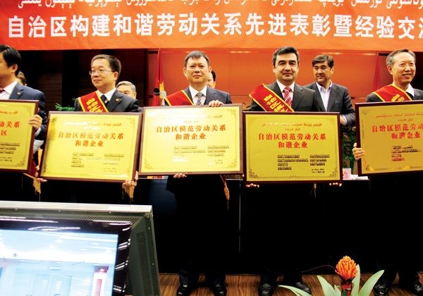 2011年12月17日,在自治區黨委電視電話會議室隆重召開的“自治區構建和諧勞動關系先進表彰暨經驗交流電視電話會議”上,新疆華春投資集團榮獲“自治區模范勞動關系和諧企業”稱號,受到自治區黨委、政府的表彰,這是新疆自治區黨委、政府授予企業的最高榮譽。自治區黨委副書記、自治區主席努爾•白克力出席會議并作了重要講話,并與自治區黨政領導同志會見了受表彰的模范勞動關系和諧企業和工業園區代表。