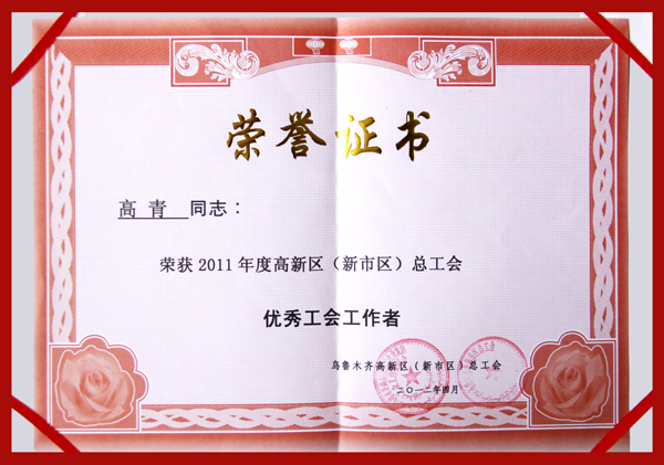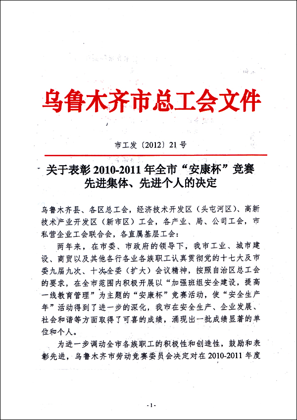 在剛剛結(jié)束的工會(huì)工作年度評(píng)比中,華春工會(huì)與華春工會(huì)主席高青被高新區(qū)(新市區(qū))總工會(huì)評(píng)為“先進(jìn)基層工會(huì)一等獎(jiǎng)”、“優(yōu)秀工會(huì)工作者”,同時(shí)榮獲由烏魯木齊市總工會(huì)、市安全生產(chǎn)監(jiān)督管理局評(píng)定的“2010-2011年安康杯競(jìng)賽先進(jìn)集體”。