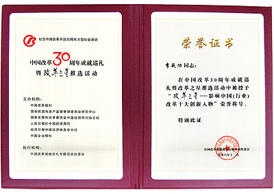 旨在關注改革進程、展示改革成就、聚焦改革之星、弘揚改革業績,由中國改革報社、國務院國有資產監督管理委員會研究中心、國家發展和改革委員會中國經貿導刊雜志社、人民日報社中國經濟周刊、經濟日報中國經濟信息雜志社及中國企業報社六家機構特聯合主辦的中國改革開放30周年成就巡禮暨改革之星頒獎典禮,于11月6日下午在莊嚴的北京人民大會堂隆重舉行。新疆華春投資集團董事局主席兼總裁李成功先生榮獲“改革之星——影響中國(行業)改革十大創新人物”獎項。